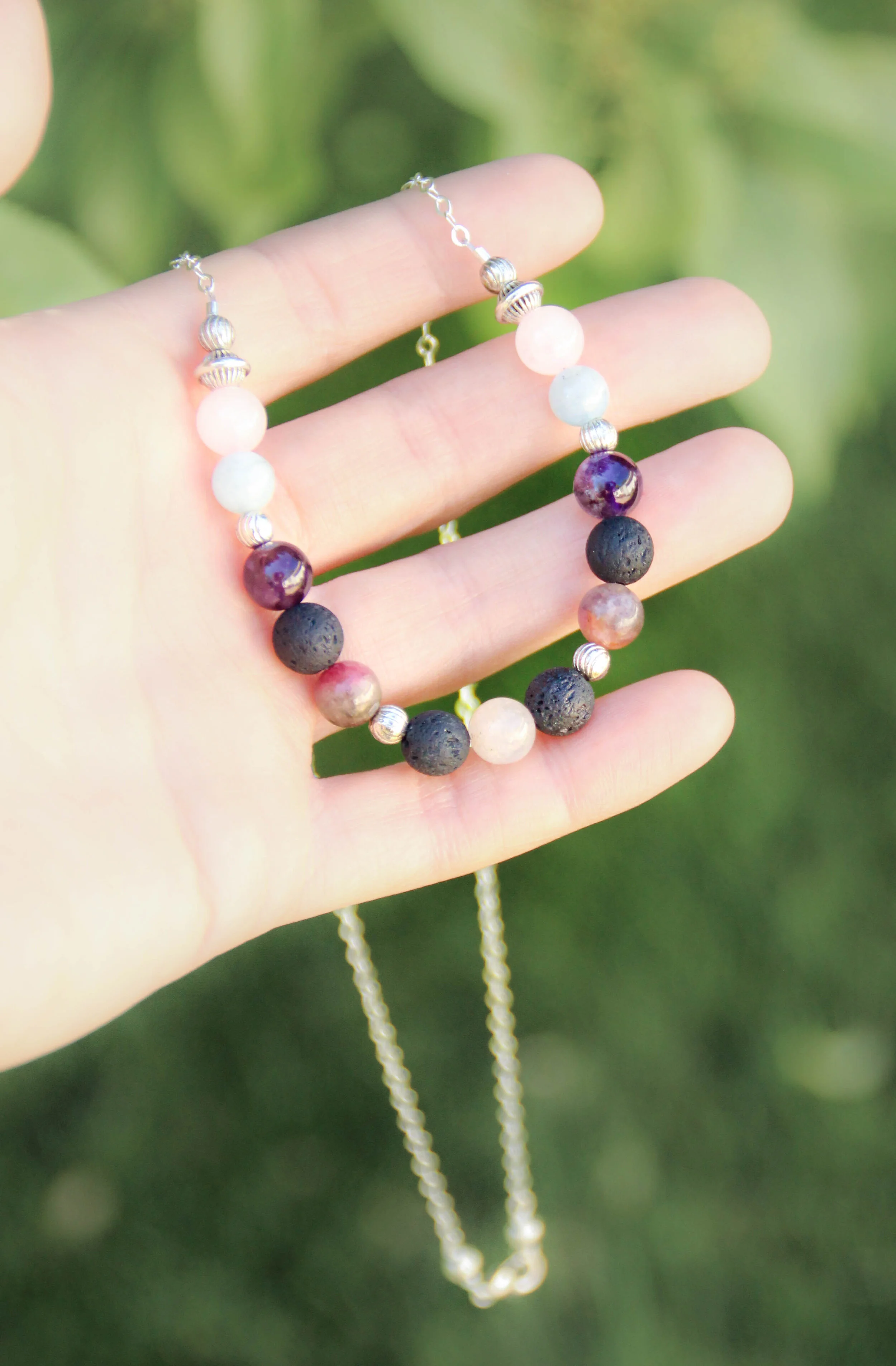 If using the Aromatherapy Necklace, add a drop or two of lavender, vetiver, or a calming blend like Rutavala to the lava beads. Place your hand over your heart, close your eyes, and say aloud what you wish to invite (peace, protection, or deep sleep).